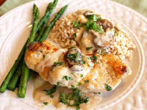 5 Pour mushroom sauce over chicken; top each piece of chicken with one slice cheese. Fold cheese in half if it is too wide for chicken piece.