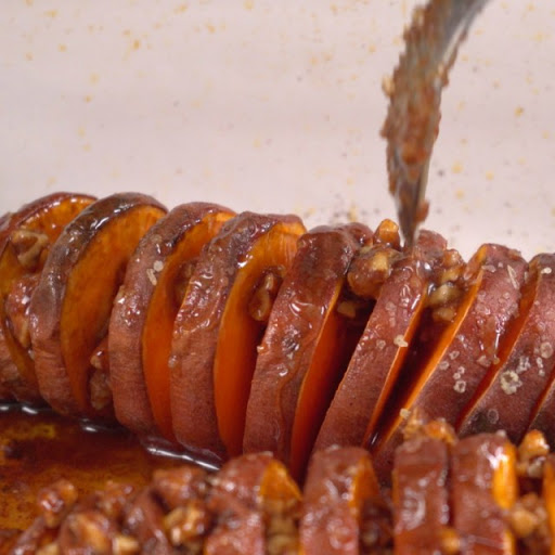 Spoon the maple syrup mixture over and in between the baked sweet potato slices, pushing the pecan pieces in between each slice.