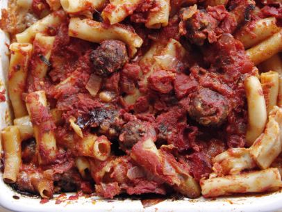 To assemble: Spoon some cooled sauce on the bottom of a 9-by-13-inch dish. Layer on half of the pasta, half the sauce and meatballs and then half the mozzarella cubes. Repeat the layers once more and top the dish with the grated Parmesan.