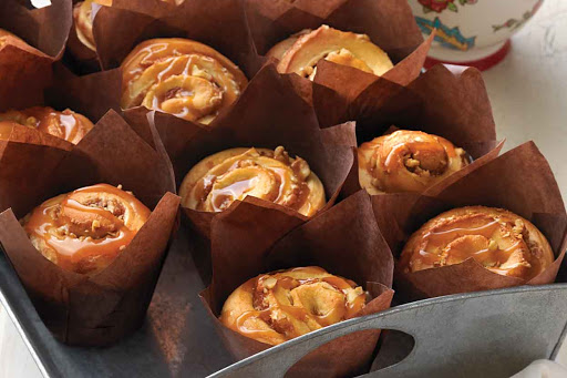 Remove the buns from the oven. Cool for 10 minutes, then drizzle with caramel sauce.