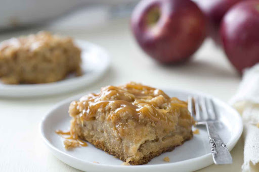 Caramel and apple is always a winning combination. These bars, cut in 3-inch squares and topped with ice cream, make a delicious plated dessert. Cut smaller, they pack nicely in your lunchbox.