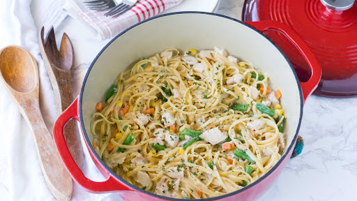 Stir in chicken and mixed vegetables, thawed; cook until heated through. Add parm cheese. Season with salt and pepper; enjoy!