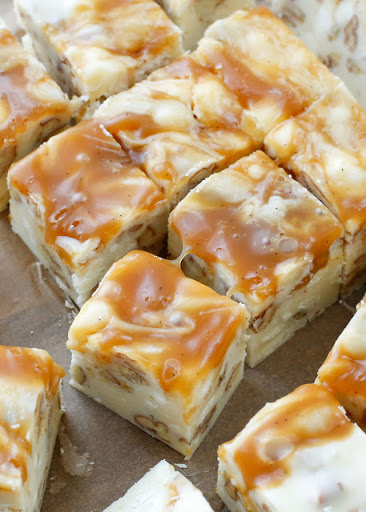 Stir until mostly smooth with just a few flecks of unmelted chocolate. Add the extract and pecans and stir to combine. Scoop onto a parchment lined tray. Spread with a spatula to approximately 1-inch thickness. Drizzle with caramel sauce. Lightly swirl the caramel into the fudge with a knife or the end of the spatula. Chill until ready to serve. Slice into 1-inch squares and store in an airtight container in the refrigerator for up to a week. Enjoy!