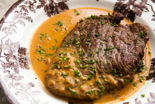 Stir in the broth mixture and bring to a boil. Cook until thickened (about 2-3 minutes), stirring often. Stir in the cream and add the steaks and any accumulated juices to the pan and cook, turning the steaks in the sauce until warmed through and the sauce has thickened. Transfer the steaks to serving plates. Stir the parsley and chives into the sauce, and pour the sauce over the steaks to serve.