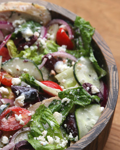 5. Assemble your salad, starting with a base of romaine lettuce. Then top with chicken, cucumber, olives, red onion, tomatoes, feta, and the dressing. Toss to evenly incorporate ingredients