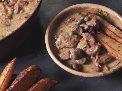 Slowly stir in the heavy cream, parsley, tarragon and peas. Serve the stew in shallow bowls over buttered egg noodles.