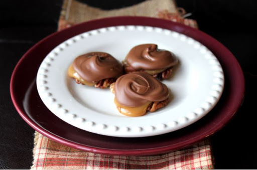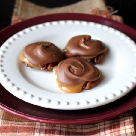 Put pecans into a large skillet. Toast them over medium high heat, stirring occasionally, until they have darkened just a bit and smell fragrant. Should only take a few minutes. Line two large cookie sheets with parchment paper and spray with cooking spray. Arrange pecans into clusters, three to a group. Leave about an inch between each cluster. To make the caramel place butter into a medium-sized sauce pan and melt over medium high heat. Add brown sugar, light corn syrup and milk to the pan. Increase the heat just a bit and stir it continually until it reaches 235-240 degrees. Stir in vanilla. Carefully drizzle about 1 1/2 teaspoons of hot caramel over each nut cluster working quickly, as the caramel will begin to set up. The caramel will stick the nuts together. Pour milk chocolate chips into a microwave safe bowl and heat in the microwave for 30 second intervals stirring between each interval until melted. Add shortening to the melted chocolate to make it more spreadable. Allow it to sit for a minute or two and then stir thoroughly. Spoon about 1-1/2 teaspoons of melted chocolate over the top of the caramel and nuts, swirling it around along the top with your spoon. Allow the chocolate to harden before serving.