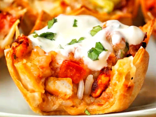 5. In an oiled muffin tin, place the first layer of tortilla squares in and push down. Push the other layers of tortilla on top of these in a star formation.