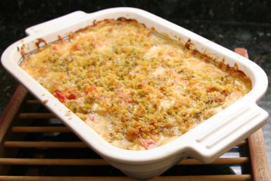 Combine the melted butter with the remaining 1/2 cup of bread crumbs and sprinkle over the cheese layer.
