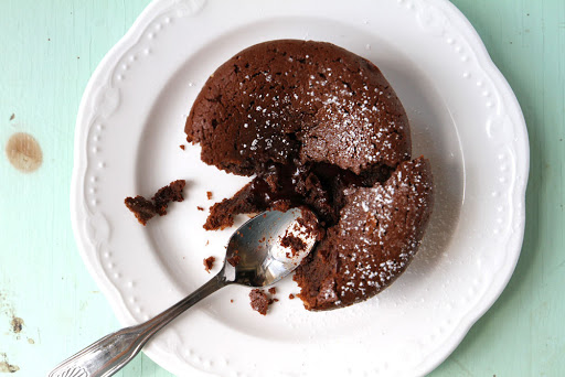 Heat oven to 425°. Grease bottom and sides of six 6-oz. ramekins with butter and dust with flour, tapping out excess; set aside on a baking sheet. Heat butter and bittersweet chocolate in a small saucepan over medium heat until just melted; remove from heat and let cool 10 minutes. In a large bowl, beat together sugar, vanilla, salt, and eggs with a hand mixer on medium-high speed until thick and pale, 3–4 minutes. Beat in melted chocolate mixture; add flour and mix until smooth. Divide half the batter between prepared ramekins and place a chilled chocolate ball in center of each; top with remaining batter and smooth tops. Bake until just set, 15 minutes. Let cool 2–3 minutes.
