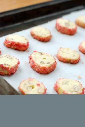 Slice sugar-coated logs into cookies about 1/4-inch thick. Transfer cookies onto baking sheet leaving about 1/2 inch of space between each cookie. Bake for 12-14 minutes, until set but not browned. Transfer cookies to racks to cool.