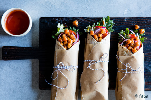 Move over, wings! Bite into this spicy and satisfying veggie wrap, which cuts out the fried chicken in favor of chickpeas. Yep, chickpeas! You’ll fill whole-wheat tortillas with a well-dressed kale salad, juicy seasonal tomatoes, and crunchy red onions. The “hot” chickpeas provide pops of protein and fiber. Go ahead and sprinkle on as much hot sauce as you can handle! And if you want to up the flavor, add a few crumbles of blue cheese.