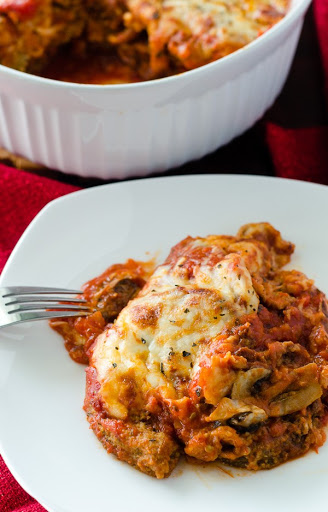 Repeat layering with remaining eggplant, sauce, mushrooms, and mozzarella, then sprinkle on remaining Parmesan.