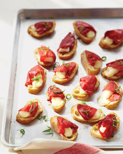Stuff each pepper with a cheese square. Place 1 stuffed pepper on each toast. Bake until cheese melts, 8 to 10 minutes. Drizzle with remaining 2 tablespoons oil. Garnish with scallion.