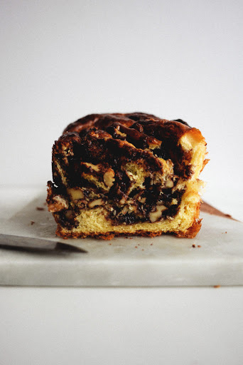 When the babka is ready to bake, pre-heat the oven to 170 C (340 F). Using a pastry brush, gently glaze the top of the babka with a light coating of the egg wash. Bake for 22-28 minutes, or until golden brown and a skewer inserted into the middle comes out clean. Remove the babka from the oven and allow it to cool in the tin for 10 minutes before turning it out and onto a wire rack to let it cool completely before serving. Serve warm or at room temperature.