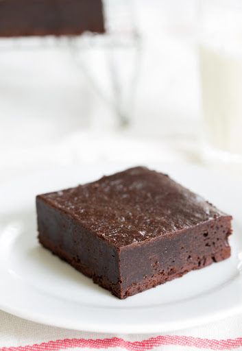 Scrape the brownie batter into the prepared pan, and smooth into an even layer with a wet spatula. Smack the bottom of the pan squarely on the counter a couple times to break any air bubbles trapped inside. Place in the center of the preheated oven and bake for 25 minutes, or until set in the center and firm to the touch. A toothpick may not come out clean. Remove from the oven and allow to cool in the pan for 20 minutes before removing it by holding onto the overhung pieces of parchment paper. Slice into squares and serve. For the cleanest slices, chill the brownies before slicing.