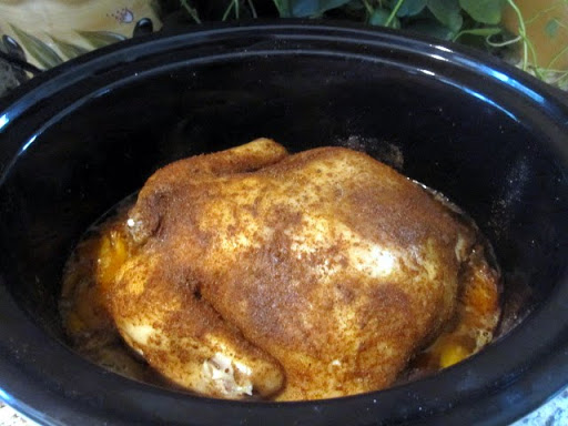 Place the spiced chicken on top of the onions in the crock pot, cover and cook on low for 5-6 hours (depending on your crock pot).