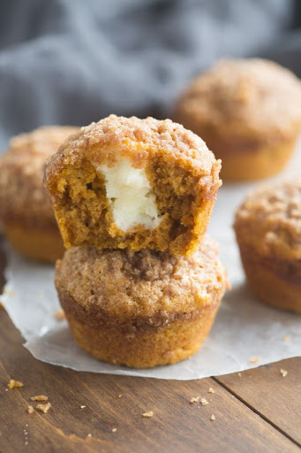 For the muffins, combine the flour, spices,baking soda and salt in a medium bowl. Stir and set aside. In a separate large bowl combine the eggs, oil, sugar and pumpkin puree. Mix until well combined. Add in the dry ingredients and mix until just combined.