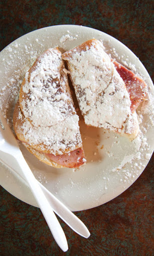 Make the sandwiches: Heat 2 tbsp. butter in a 12″ skillet over medium heat. Add 3 eggs; cook, turning, until yolk is just set, about 3 minutes. Repeat with 2 tbsp. butter and remaining eggs. Split each roll; place 3 slices ham onto each roll bottom. Top with an egg, 2 oz. cheddar, and roll tops. Return skillet to medium-high heat; add 2 tbsp. butter. Add 2 sandwiches; cook, flipping and flattening with a spatula, until browned, about 6 minutes. Repeat with remaining butter and sandwiches. Halve sandwiches, and dust with confectioners' sugar while hot before serving.
