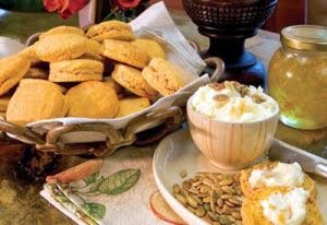 4.Roll dough to 3/4-inch thickness; cut with a 21/2-inch round cutter. Place on prepared baking sheet. Bake 10 to 12 minutes, or until lightly browned. Serve with Orange Honey Butter.