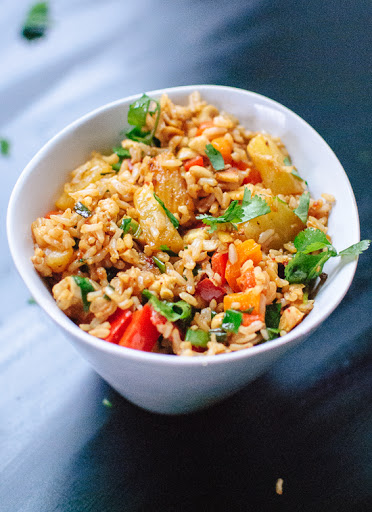 Thai-style sweet and spicy pineapple fried rice with red bell pepper, cashews and cilantro. This is a healthy and quick, vegetarian weeknight dinner!