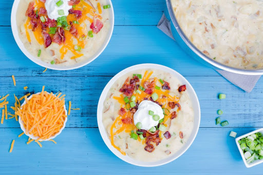 Serve topped with crumbled bacon and garnish with sour cream, scallions, and cheddar.