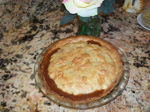 Place the pie dish on a baking sheet. Bake until the crust is golden brown, about 1 hour; check the pie after 30 minutes and cover the top and edges with foil if they become too dark. Let the pie cool on a wire rack for at least 2 1/2 hours before serving. Warm the reserved caramel sauce and serve alongside the pie for drizzling. Serves 8.
