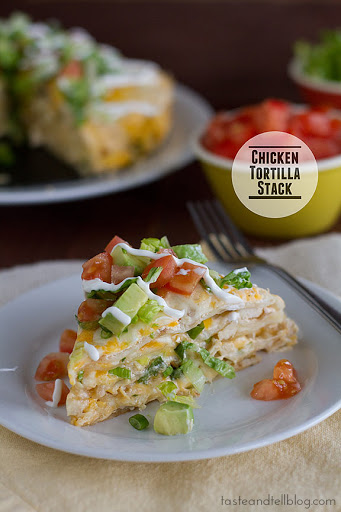Add another tortilla, sour cream, chicken, green onions and cheese. Repeat 2 more times, then lay the remaining tortilla on top.