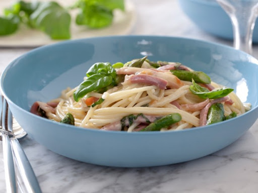 Spaghetti with Asparagus, Smoked Mozzarella and Prosciutto