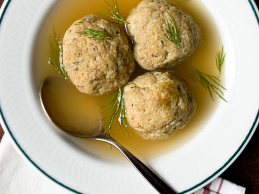 To serve, heat broth over medium heat and season with salt and pepper; add matzo balls and heat through. Garnish with dill.