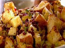 Place the bread cubes in a single layer on a sheet pan and bake for 7 minutes. Raise the oven temperature to 350 degrees F. Remove the bread cubes to a very large bowl.