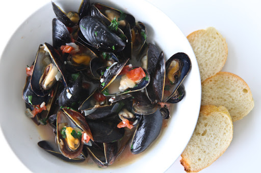 4. Arrange mussels in large bowl, pour steaming liquid over mussels.