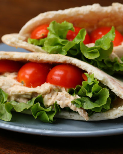 1. In a bowl, mix all ingredients except for the pita, tomatoes, and lettuce.