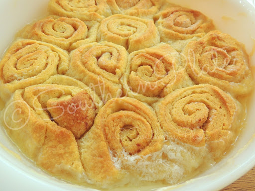 Serve warm and enjoy! Note: There will be more sauce than is pictured here because this photo was taken after a few were removed. Butter Rolls will be dumpling like in texture on the bottom and flaky on the top. Spoon additional sauce over rolls before serving.