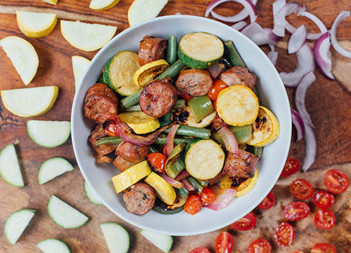 You can start with raw or cooked sausage, just make sure it’s cooked when you add it to the veggies.