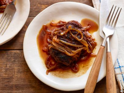 For the meat mixture: Combine the ground beef, breadcrumbs, ketchup, dry mustard, Worcestershire sauce, bouillon and some salt and pepper. Knead until all combined. Form into 4 to 6 oval patties, and then make lines across the patties to give them a "steak" appearance.