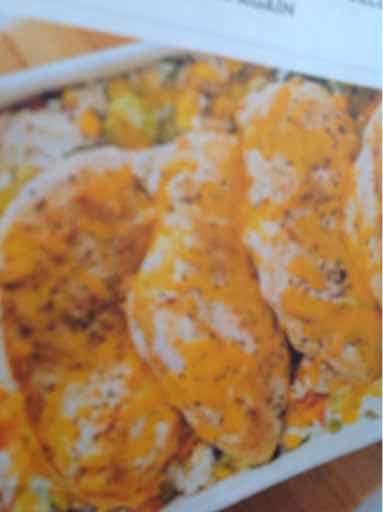 Bake at 375F until chicken is cooked through and rice is tender- about 45 mins. Sprinkle cheese over chicken Remove chicken and stir rice before serving.