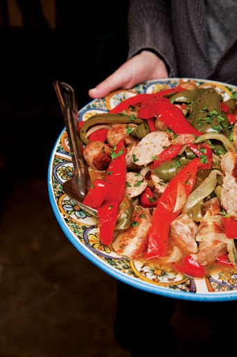 Bring sausages, 3 tbsp. oil, and ⅓ cup water to a boil in a 12″ skillet over medium-high heat; cover, and simmer until sausages are half-cooked, about 8 minutes. Uncover and cook, turning, until sausages are browned all over, about 5 minutes. Transfer to a cutting board and cut into 4 pieces each; set aside. Return skillet to heat along with remaining oil. Add onions and bell peppers; cook until soft, about 6 minutes. Add chile flakes and garlic; cook until fragrant, about 2 minutes. Return sausages to skillet along with stock, oregano, and salt and pepper; boil. Cover and cook until sausages are cooked through, about 10 minutes; uncover and cook until sauce is slightly reduced, about 4 minutes. Sprinkle with parsley.