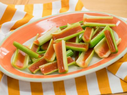 Trim the celery sticks so they fit side-by-side in a casserole dish, then lay them flat with the curved side facing up. Pour the mixture over the celery, trying to keep as much of it inside the celery cavities as possible. Refrigerate until firm, at least 2 hours.