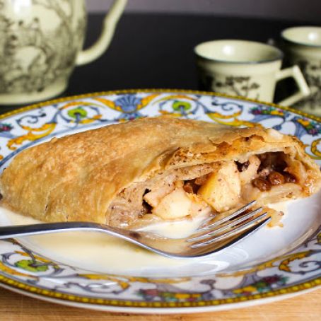 9. Bake for 20 minutes, then reduce oven to 350°F. Continue to bake until strudel is golden and apples are tender, about 30 minutes more. Transfer pan to wire rack and let cool. Slice and serve with fresh whipped cream or vanilla sauce.