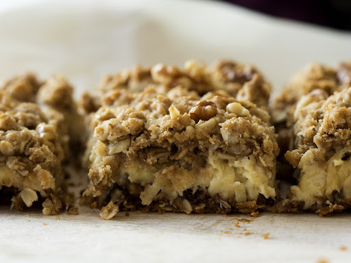 Like an apple crisp-cheesecake hybrid, these bars are seriously addictive. We started with a base crumble that we used half of to pat down into a crust, then we filled that with our sour cream apple filling, and topped everything off with the remaining crumble and a healthy smattering of walnuts. Die-hard apple fans will love these bars. Even those who only tolerate apples will love these bars – it’s impossible not to!