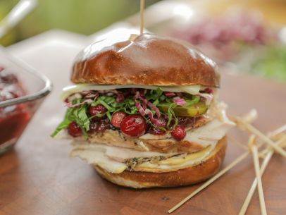 For the sandwiches: Smear the bottoms of the pretzel rolls with mustard and mayonnaise. Working from the bottom up, layer the sandwich with a pile of sliced turkey (pile it high!), some Cranberry-Onion Jam, a pickle, a pile of romaine and radicchio, and finally a slice provolone and Swiss cheese. Place top half of the rolls on top and secure with sandwich picks.