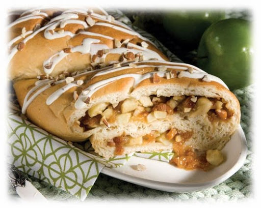 In a large, combine apples, caramels, sugar, 1/4 cup alomnds, cinnamon, and flour. Remove dough from cans, and cut a 1 inch deep slit down center of both loaves, creating a pocket for filling. Stuff both loaves with apple mixture, and carefully seal the sides together.