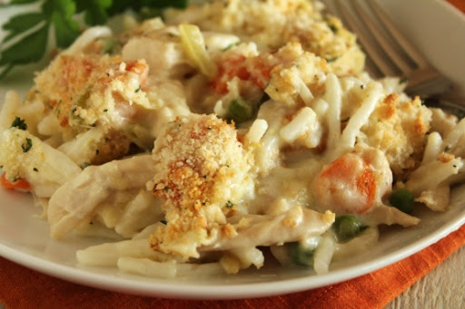 Preheat the oven to 350 degrees. Butter a 1 1/2 quart casserole. Layer half of pasta, half of mushroom and turkey mixture and repeat with pasta and turkey mushroom mix. Scatter Parmesan and bread crumbs over the top and dot with remaining tablespoon of butter. Heat for 45 minutes or until heated through, sauce is bubbling and top is browning. If you wish, slide casserole under the broiler for a moment to brown the top.