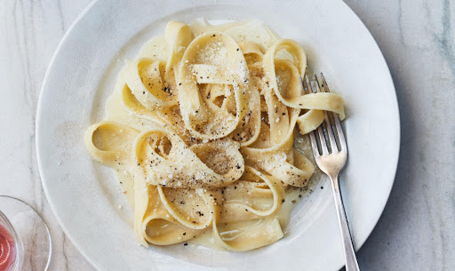Transfer 1 cup pasta cooking liquid to a large skillet. Bring to a gentle simmer, then whisk in butter, a piece at a time, until melted. Whisking constantly, gradually add cheese, making sure it’s completely melted and incorporated before adding more. Add pasta and toss to coat, adding more pasta cooking liquid as needed, until sauce blankets noodles completely. Serve topped with pepper and more cheese.