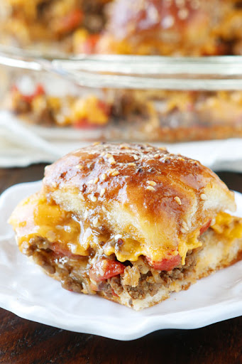 Place bottom half of buns in prepared pan. Top with beef & sliced cheese. Finish off with the top half of the bun.