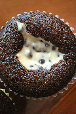Stir together the flour, sugar, cocoa, baking soda and salt in a large bowl. Add the water, oil, vinegar and vanilla. Beat for 3 minutes. Fill muffin cups 2/3 full with batter. Spoon 1 Tsp of the filling into the center of each cupcake. (if cupcakes are regular size use a tablespoon.