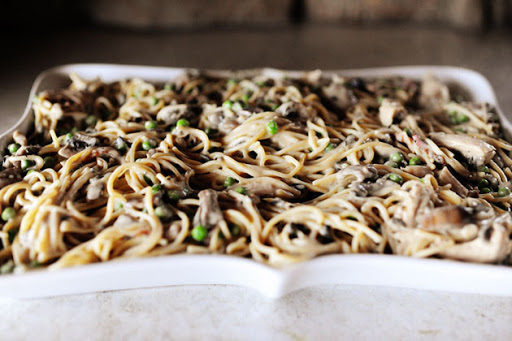 Add the cooked spaghetti and stir it to combine. Splash in more broth as needed; you want the mixture to have a little extra moisture since it will cook off in the oven. If it's a little soupy, that's fine! Add up to 2 more cups of liquid if you think it needs it.