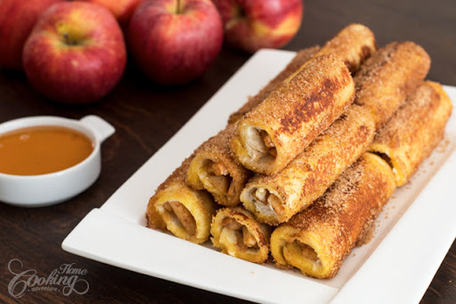 Place apple pieces, cinnamon and lemon juice in a small saucepan. Cook over low-heat for about 3 minutes, until apples start to soften. Transfer apples into a bowl and set aside to cool until ready to use. In a bowl combine sugar with cinnamon and set aside. In another bowl beat eggs with milk and set aside. Remove crust from each slice of bread and flatten using a rolling pin. Spread cream cheese evenly on each slice of bread. Add about 1-2 tsp of apples and roll up each slice. Heat a non-stick pan over medium heat and melt about 1 tbsp of butter. Dip each roll in egg mixture and cook on each side until golden brown. Cook 3-4 roll at a time. Clean the pan slightly with a paper towel and repeat until all rolls are cooked. Roll into the sugar cinnamon mixture. Serve warm and dip in maple syrup if desired.