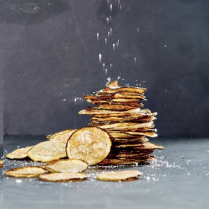 3. Place zucchini slices in a single layer on 2 baking sheets lined with parchment paper; sprinkle evenly with salt. Bake at 200°F for 2 to 2 1/2 hours or until chips are dried, crisp, and lightly golden, flipping chips halfway through baking. Remove from oven; cool completely.